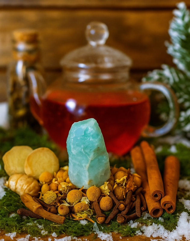 De mix van Kaneel, Zoethout, Kruidnagel, Gember en Kamille is een verwarmende combinatie van kruiden die perfect passen bij het thema van de Aquamarijn: "Winter".